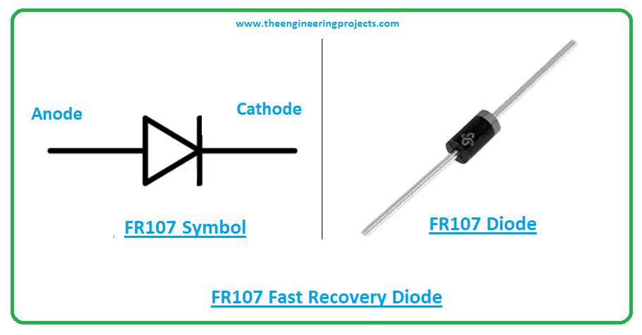 - Fr107 is a fast recovery diode mainly used in fast switching applications. It comes with two terminals called anode and cathode. The grey colored band identifies the cathode side while the other side is the anode.