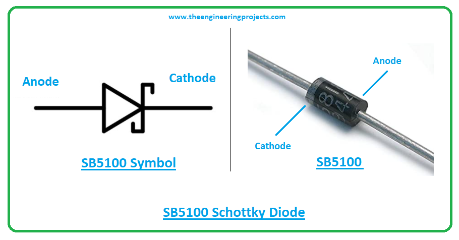 - SB5100 is a two-pin device, these pins are also called terminals. Where one pin is the anode and the other pin is the cathode used for the external connection with the electronic circuit.