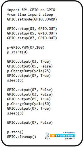 To regulate the DC servo’s speed, we will write some Python programs that will be run on the Raspberry Pi. They will be used to communicate with a motor driver IC, which will control the speed and direction of the motor. The GPIO pins on the Raspberry Pi will be used to do this.