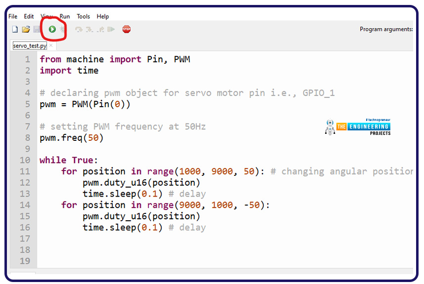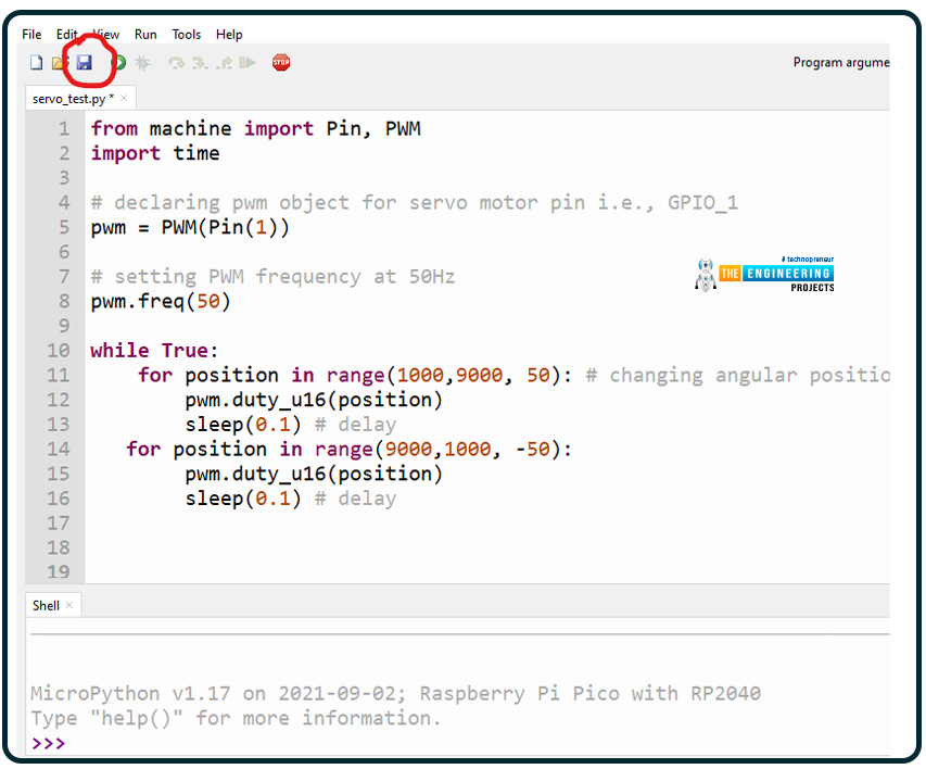 - Click on the ‘save’ icon to save the servo motor interfacing program.