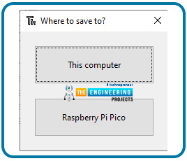 - After clicking on the ‘Save’ icon, an option ‘Where to save to?’ will pop-up. You can select any of the ‘Raspberry Pi Pico’ option.