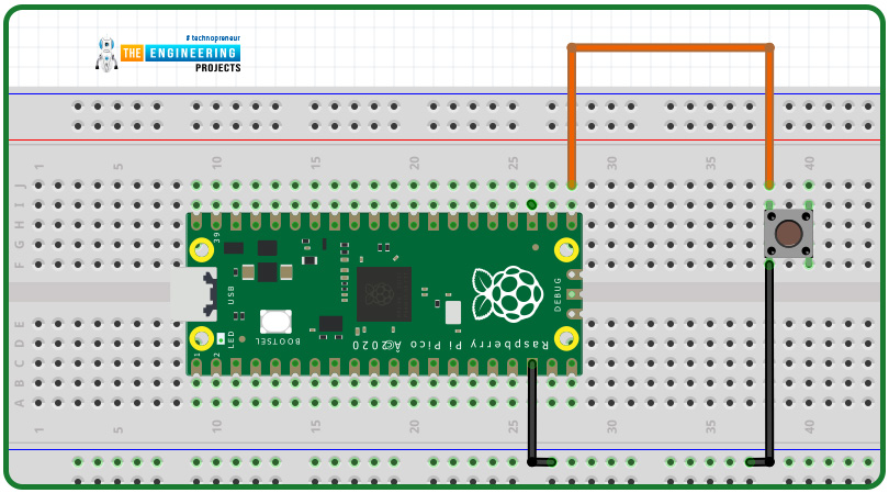 A schematic is attached below representing the interfacing of a push button with raspberry pi Pico: