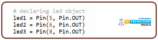 - Initially, we are declaring some led objects assigning various ‘output’ pins for LED interfacing.