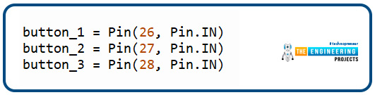 - So far, we were configuring raspberry Pi Pico’s GPIO pins as output pins. Now, we will declare some ‘button_x’ objects where we will be configuring GPIO pins as input. Here we are declaring three push button objects.
