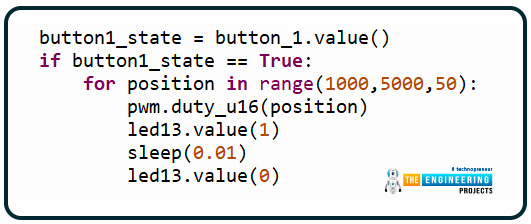 - Some conditional statements are used to change the position of the servo motor. The first push button is responsible for changing the shaft position for 0 to 90 degrees (1000 to 5000 microseconds) and the LED represented by object ‘led13’ will start to blink as an indicator.