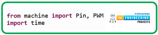 - So here we are importing two libraries from machine i.e., ‘Pin’ and ‘PWM’ to access the GPIO pins and implement pulse width modulation respectively. The third library is ‘time’ to add delay if required.